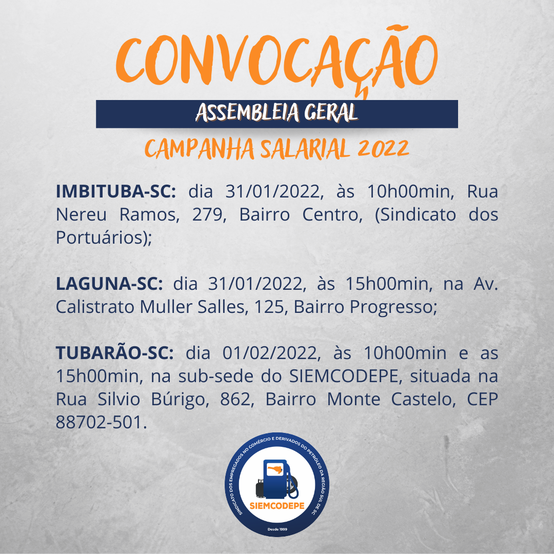 O Sindicato dos Empregados no Comercio de Derivados do Petróleo da Região Sul de Santa Catarina – SIEMCODEPE, inicia os trabalhos da Campanha Salarial, Data-Base 2022, convocando os trabalhadores e trabalhadoras de postos de combustíveis dos municípios de Imbituba-SC, Laguna-SC e Tubarão-SC, sindicalizados ou não, para participarem das Assembleias Gerais Extraordinárias, que serão realizadas nos dias 31/01 e 01/02 de 2022.